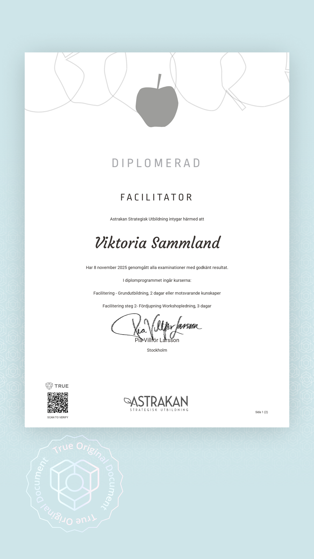 Alla TRUE -document är säkrade med blockchain-teknologi och kan verifieras som äkta. Klicka på verifieringsknappen bredvid dokumentet eller skanna QR-koden med din smartphones kamera. Ingen app krävs - dokumentets äkthet verifieras omedelbart.