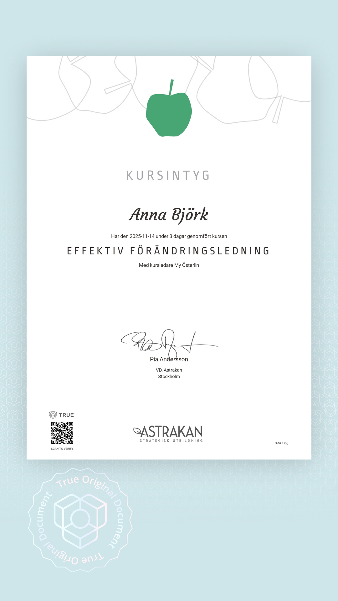 Alla TRUE -document är säkrade med blockchain-teknologi och kan verifieras som äkta. Klicka på verifieringsknappen bredvid dokumentet eller skanna QR-koden med din smartphones kamera. Ingen app krävs - dokumentets äkthet verifieras omedelbart.