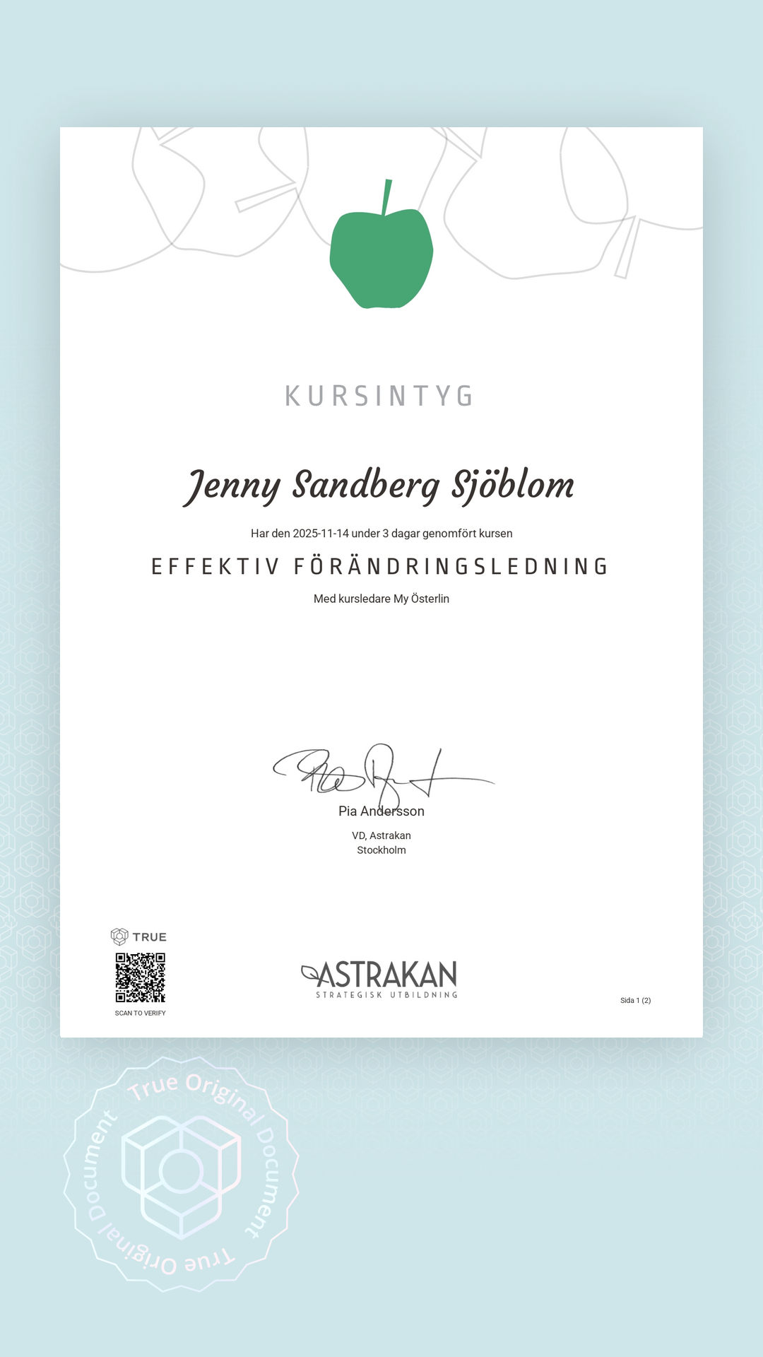 Alla TRUE -document är säkrade med blockchain-teknologi och kan verifieras som äkta. Klicka på verifieringsknappen bredvid dokumentet eller skanna QR-koden med din smartphones kamera. Ingen app krävs - dokumentets äkthet verifieras omedelbart.